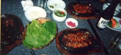 一階は蒲焼きを焼いて売る屋台程度の場所だけで、すぐ側の階段を上がると座敷の食堂になっている。靴脱ぎ場の周りの土間ではホースからひいた水をたらいに溜め、山菜をもどしたり、洗ったりしている。セメントの所も木の部分も、とにかく古い。韓国の飲食店特有の古さは「これも文化」だろう。日本のように「老舗」感覚が無いから、店をきれいに改装する気がおきないのだと思う。飲食店業で小金を溜めたら早く他の職業に変わりたいそうだ。食べ物屋さんの地位が低いようです。