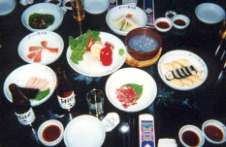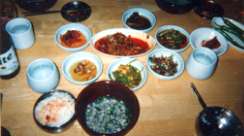 刺し身の飾りにレッドピーマンが附いてたり、巻寿司やいなり寿司のお皿が出たりしていますが、私達はあまり気にしなかった。しかし、姜 在彦先生と料理の姜 連叔先生は非常に気になっておられたらしく、食事もだいぶ進んで、お酒が廻った為でしょうか、姜 在彦先生は料理を運んで来たウエイトレスに大声でどなりつけた。突然のことで、先生のお顔の見えない横の列にいたので聞き取れなかったが多分韓国語ででしょう。「韓国の文化と食を訪ねる旅」の最後の夕食は「韓国伝統料理」で!。と言う筈だったのです。が、正統の「韓国伝統料理」では無いではないか、というわけで、先生はとても立腹されたのです。店の人は先生の怒りの意味が良く解からない様子でしたが、コンダクターの文さんは困ってしまっているので気の毒になった。値段との兼ね合いも有るから、この程度の店ならいいだろうとの判断だったのだろうが、何しろ「韓国の文化と