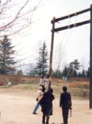 韓国のブランコがあった。高くて長いぶらんこで女の子がチマをなびかせて大きく漕ぐ絵などを見た事が有る。姜 連叔先生は若い頃を懐かしんで、ためらわず元気に漕ぎ出したので拍手が湧いた。誘われた若い娘(コ)のほうが躊躇っていた。松林と川の向こう側に苔むしたように見える