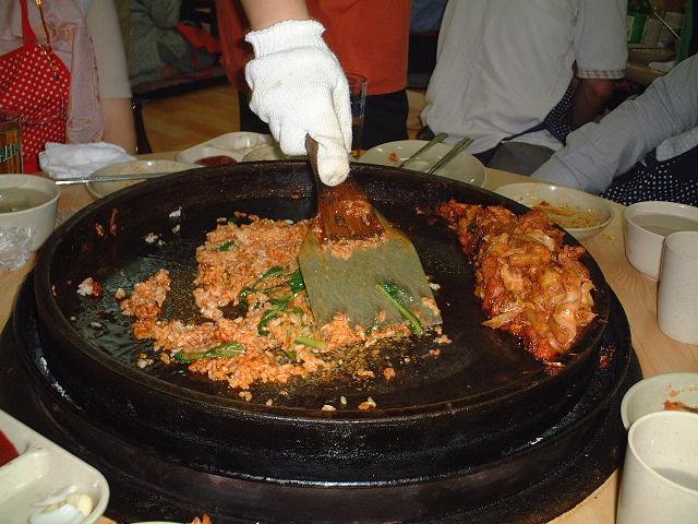 夕食は、又バスで春川市内の「元祖タッカルビ」店へ行く。さすが春川発の代表的なメニューだけあって、そのあたりはタッカルビの店だらけ。カルビは御馴染みの骨付き牛肉だが、「タック」は「鶏」のことでトッポキ、キャベツ、サツマイモなどと一緒に韓国特有の辛み味付けで炒める。カルビ焼きの網ではなく