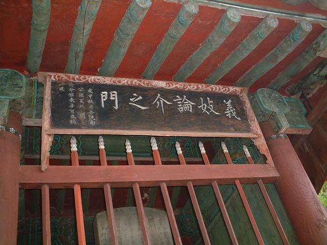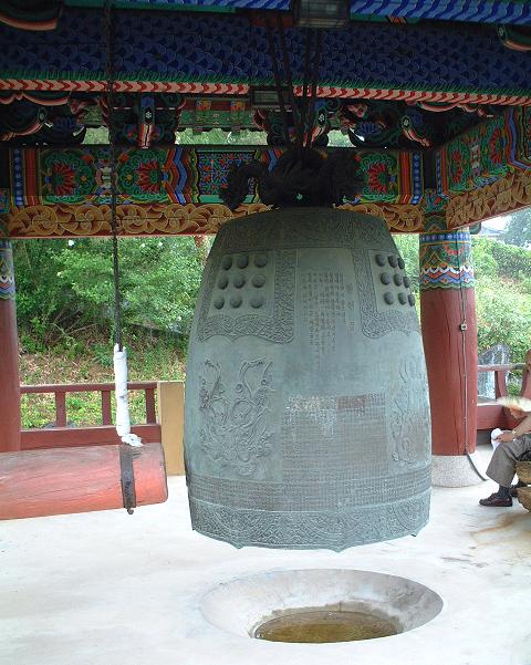 お寺の鐘楼に上がって雨宿り。韓国の釣鐘は下の方にぶら下がっている。傘が無いから鐘楼への階段を上がるのさえ濡れるのを避けたい人達はこの下で雨宿りした。私の傘は旅行先で無くしてもいいし帰りには捨ててこようと思っていた汚い晴雨兼用傘だが、よく役に立ち、捨てるチャンスが無くて持ち帰ってきてしまった。