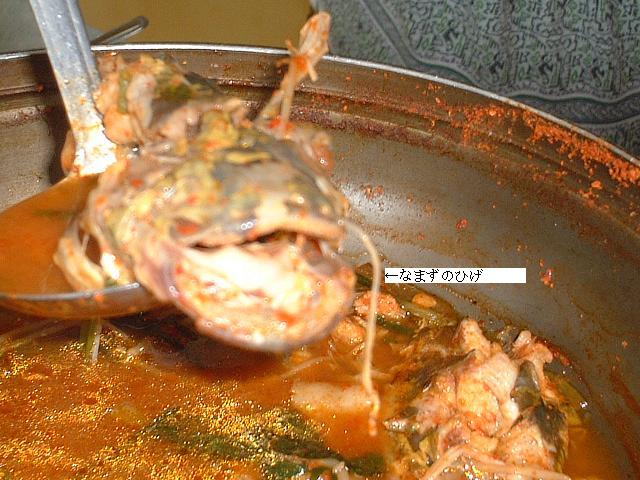姿を現したナマズ君。充分泥を吐かせてあるので癖は無くて味もよく、唯「魚のお鍋」だった。