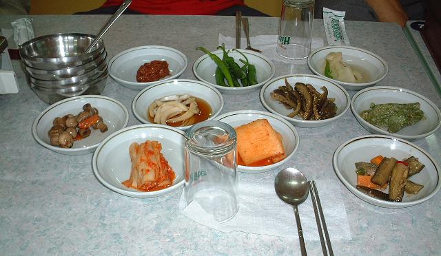 茄子の一品(写真右端)が余分に付いたということだ。郷土料理「ノンメギメウンタン(田のナマズ辛汁)」の鍋底近くなって