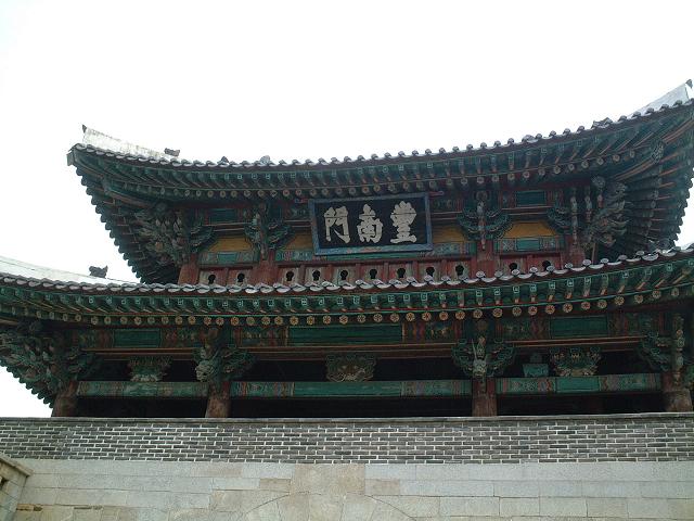 国宝の豊南門。東西南北の内ただ一つ残された門で、ソウルの南大門の如く街中にデンとそびえるが、囲ってあって通り抜けは出来ない。近所の子供が寄ってきて見ているけれど、姜在彦先生と河宇鳳先生が入られるので躊躇無く囲いを跨いで中に入る。アーチ型の石門をくぐってから上を仰ぐと